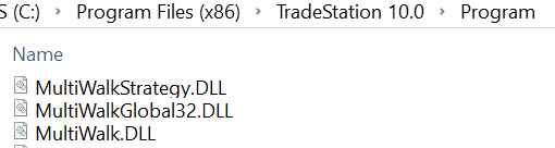 Confirm that the three MultiWalk DLL’s (MultiWalk.DLL, MultiWalkStrategy.DLL and MultiWalkGlobal32.DLL) are in the TradeStation program folder. The default TS installation folder is C:\Program Files (x86)\TradeStation 10.0\Program. If you have installed TS in a different location, you will need to copy the three MultiWalk DLLs there.