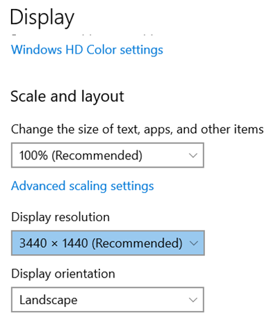 3. If you have increased Windows’s display scaling to anything greater than 100%, revert back to 100% and choose a specific display resolution, instead, to achieve the same scaling effect. I have found that TradeStation does not work well with Windows scaling, but does work well when setting the resolution directly to achieve the same scaling effect.  Just choose a resolution suitable for your monitor that upscales the resolution.  You may need to try a couple to find the best match with your monitor.  These settings can be found the Windows system display settings.