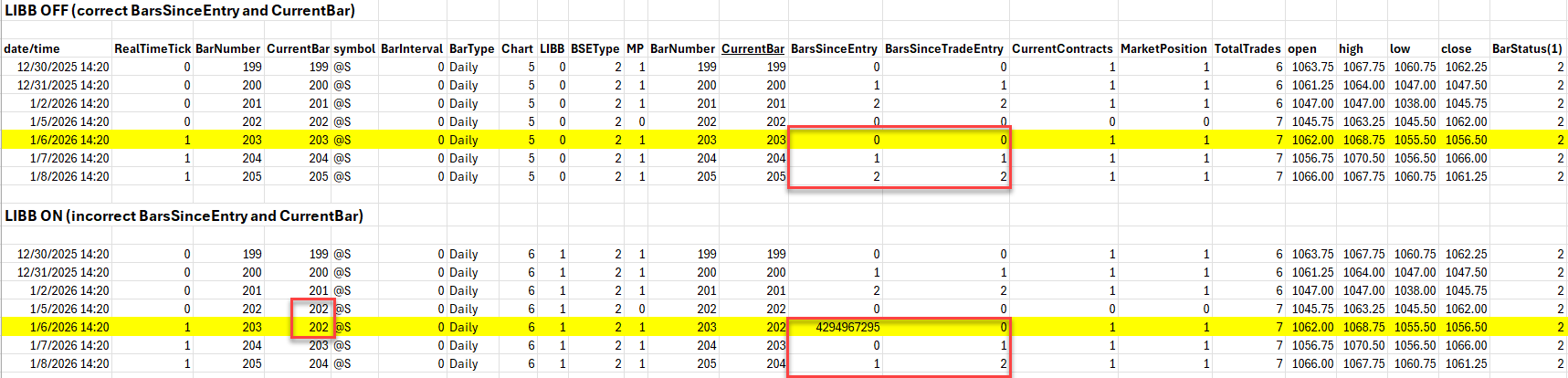 If all these conditions occur, then BarsSinceEntry will either be zero or some large random corrupted value on the first real-time bar and, from that point forward, BarsSinceEntry will be off by one compared to the chart that had LIBB off.  The chart with LIBB off ran correctly in this scenario.