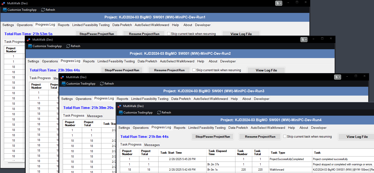 For example, you can divide your project up into two or three MultiWalk projects (such as giving each a set of different symbols), and potentially maximize the run time by running multiple MultiWalk projects simultaneously. As a rule-of-thumb, divide the number of threads of your CPU by the number of projects you want to run simultaneously, but do not exceed 8 threads per project and, if possible, do not make it less than 4. Anything less than 4 begins to increase the project time dramatically.